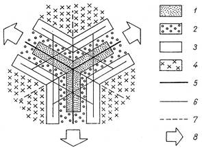 Структура поляризованной организационной агломерации поселений была также предложена Б.М. Эккелем .(рис.2). Она разработана так как и у Б.Б. Родомана на основе использования симметрично отраженного графа рационального жизненного цикла населения: отдых-жилье - санитарно-защитная зона-производство, где в качестве оси симметрии выступают «коридоры» инфраструктуры. Б.М. Эккель считал, что в целях улучшения условий жизни населения и организации рационального природопользования целесообразно располагать функциональные районы ежедневных жизненных циклов населения в виде ориентированных графов, где места жительства и основные места обслуживания размешались бы между местами работы и отдыха, причем должно быть предусмотрено сохранение подобной ориентации в процессе роста и развития систем взаимодействия природы, населения и техники. Это позволит оптимизировать городскую среду, улучшить экологическую ситуацию.