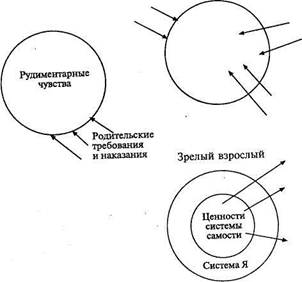 На рис. 34 авторы представляют свои взгляды на развитие зрелой совести, берущей начало в рудиментарной осведомленности о социальных ценностях, проистекающих из требований и наказаний родителей. По мере роста ребенка родительские требования интернализуются в представление о «правильном» и «неправильном». При этом значительную роль играет механизм