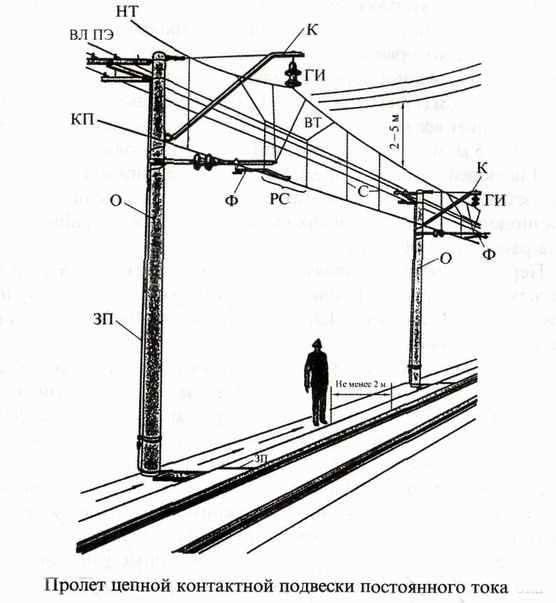Несущий трос; (НТ) подвески крепится через гирлянду изоляторов (ГИ) к консоли (К), закрепленной на опоре (О). Контактный провод (КП) с помощью струнок (С) подвешивается к НТ. Конструкция струнок вместе с другими устройствами должна обеспечить беспровесное положение КП. С помощью фиксаторов (Ф) контактный провод фиксируется на консолях опор.