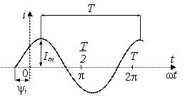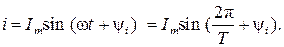 Максимальное значение функции Im называют амплитудой тока; T − период изменения тока; ψi − начальная фаза тока. Частота тока − число колебаний за одну секунду: f=1/T, 1/с (Гц). Величину ω =2π/T называют угловой частотой и измеряют в рад./с. Аргумент синусоидальной функции (ωt + ψi) называют фазой. Текущее значение i называют мгновенным значением тока.