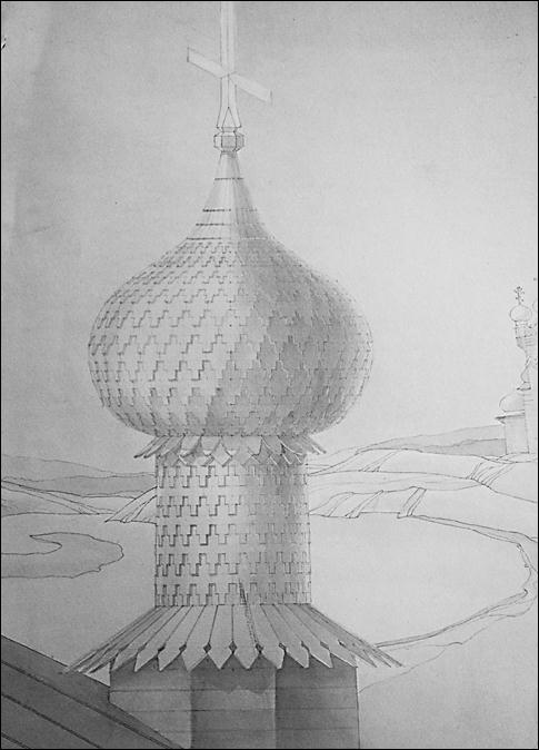 Рис. 27 Отмывка фрагмента и детали («луковки»)деревянной церкви