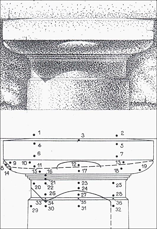 Рис. 51 Эских объемного изображения и схема распределения светотени по поверхности тосканской капители