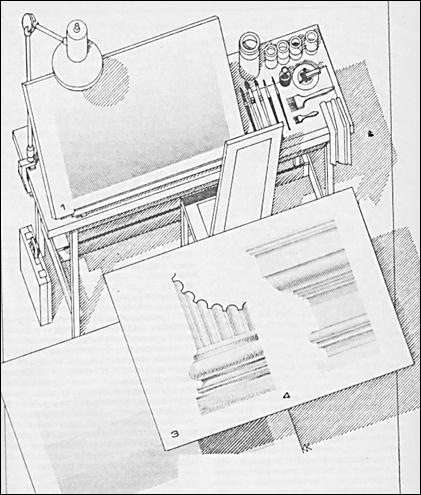 Для выполнения курсовой работы по отмывке требуются все необходимые материалы и инструменты для вычерчивания и обводки чертежа – основы (подрамник, рейсшина, угольники, рапидограф или рейсфедер, карандаши) и специальные материалы и принадлежности для отмывки – китайская тушь, кисти, фильтры, губка или поролон и т.д. (рис. ).