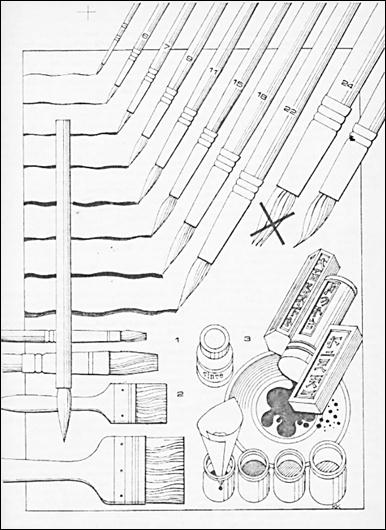Рис. 9 Кисти круглые и плоские, флейцы, платочная китайская тушь.