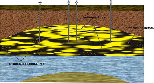 Окклюдированный газ – это газ, выделившейся из нефти при снижении пластового давления ниже давления насыщения. При дальнейшем снижении давления пузырьки окклюдированного газа, увеличиваясь в размерах, сливаются и могут несколько увеличить объем свободного газа.