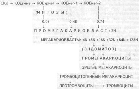 Истинные митозы, т.е. деление клеток, присущи только КОЕ-мег. Для промегакариобластов и мегакариобластов характерен эндомитоз (глава I), т.е. удвоение ДНК в клетке без ее деления. После остановки эндомитоза, в основном после 8, 16, 32, 64-кратного удвоения ДНК, мегакариобласт начинает дифференциацию до тромбоцитарного мегакариоцита, образующего тромбоциты.