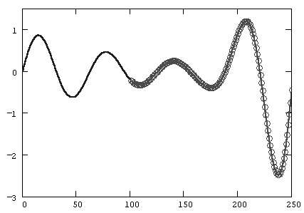 Таким образом «предсказывающаяся функция» predict(v,m,n)использует существующие данные, чтобы предсказать новые данные, которые находящиеся за пределами задания. Она использует линейный алгоритм предсказания, который является достаточным, когда функции гладкие или знакопеременные, хотя не обязательно периодические.