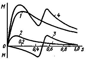 | Рис. 6.49. Зависимость электромагнитного момента от скольжения при асинхронном пуске синхронного двигателя |