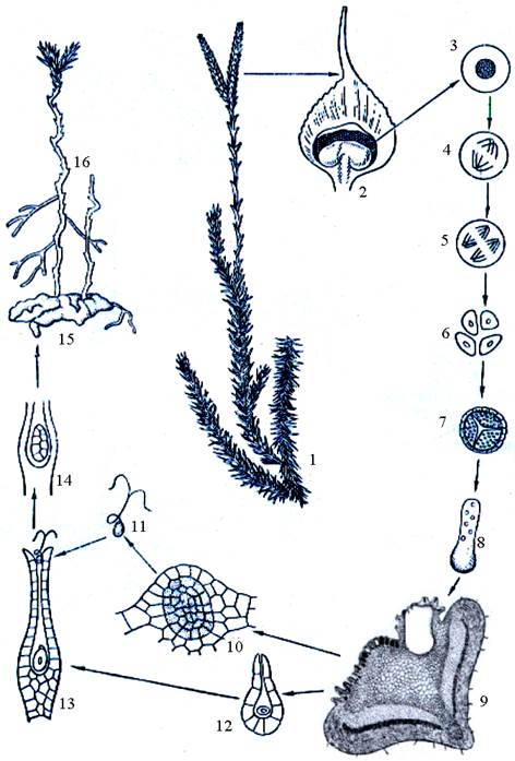 Рис. 1. Схема жизненного цикла морфологически равноспорового растения – плауна булавовидного (Lycopodium clavatum): 1 – спорофит (взрослое растение); 2 – спорофилл со спорангием; 3–6 – развитие спор из материнской клетки (спороцита) путем мейоза; 7 – спора; 8 – прорастание споры; 9 – обоеполый гаметофит (заросток); 10 – антеридий; 11 – сперматозоид; 12 – архегоний с яйцеклеткой; 13 – архегоний с яйцеклеткой и сперматозоидом; 14 – деления зиготы (развитие зародыша); 15 – остатки заростка; 16 – молодой спорофит.