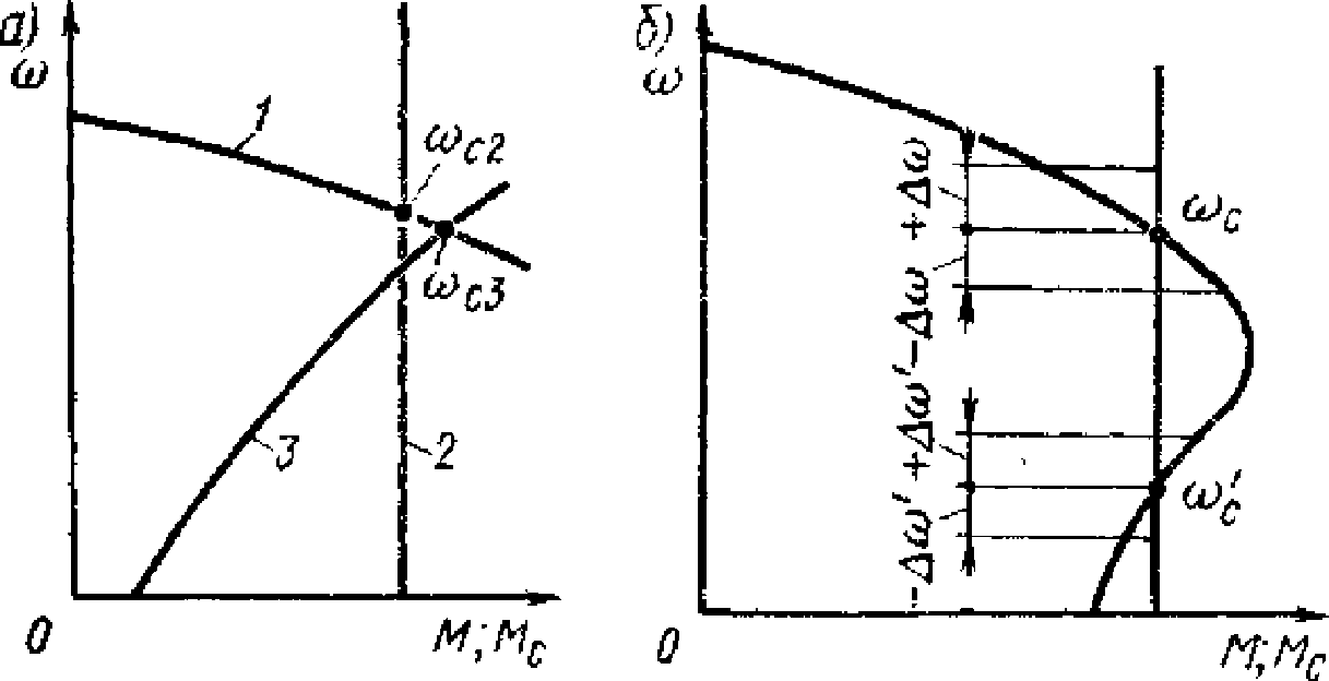 Располагая механическими характеристиками ЭД и механизма, легко найти значение угловой скорости ЭД при установившемся режиме работы привода. Поскольку в этом режиме система привода находится в состоянии равновесия, т.е. М = Мс, очевидно, что установившаяся скорость будет определяться точкой пересечения механических характеристик. Например, для характеристики I двигателя (рис. 5. а) и характеристик 2 и 3 механизмов установившимися скоростями будут ωс2 и ωс3 Если же механические характеристики ЭД и механизма не пересекаются, то установившийся режим работы привода в таком случае невозможен. Следует иметь в виду, что не в любой точке пересечения характеристик работа ЭП может быть устойчивой. Например, на рис. 5,б механические характеристики ЭД и механизма пересекаются в точках установившегося режима ωс и (ωсштрих). Однако точка (ωсштрих) соответствует неустойчивому установившемуся режиму. Положительный динамический момент при уменьшении скорости и отрицательный при ее возрастании обеспечит возврат системы привода в точку ωс.
