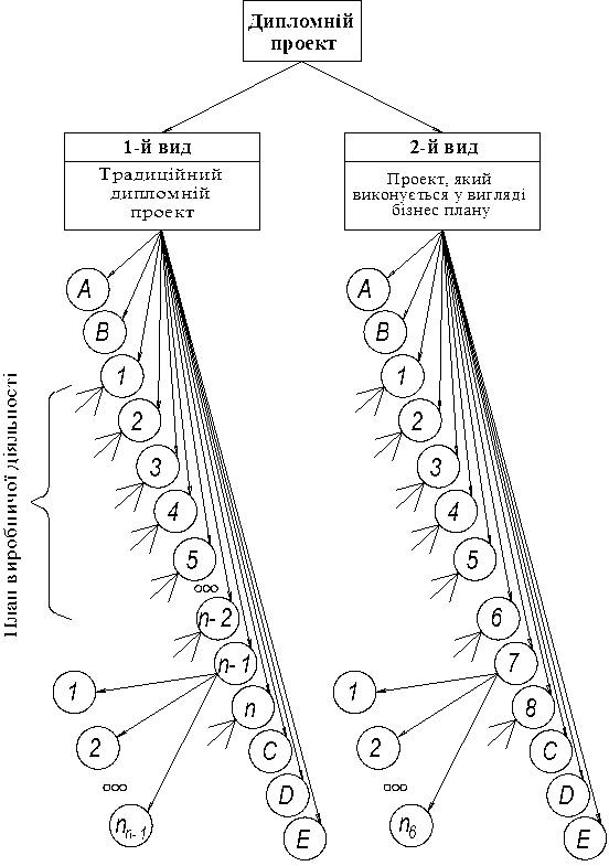 Зміст розділів дипломного проекту, виконуваного у вигляді бізнес-плану, обумовлюються роботами [1,2,3,4]. Склад розділу може відповідати пунктам 1, 2, 3, 4, 5 традиційного дипломного проекту (рис. 3.1), що обумовлюються темою дипломного проекту.