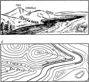 Горой называют возвышенность конической формы. Гора высотой менее 200 м над окружающей местностью называется холмом. Самую высокую точку горы называют вершиной, от которой во все стороны местность понижается, превышения имеют отрицательный знак. Боковые поверхности горы называются скатами, которые в нижней части заканчиваются подошвой. Остроконечная верхняя часть горы называется пиком, а плоская — плато. Котловиной называют углубление конической или чашеобразной формы. Самую низкую точку котловины называют дном, от нее во все стороны местность повышается, превышения точек имеют положительный знак. Боковые поверхности котловины также называют скатами, которые в верхней части заканчиваются бровкой, или краем. Небольшие котловины с крутыми скатами называют воронками.
