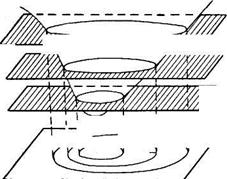 Горизонтали, изображающие гору, представляют замкнутые кривые и чем круче скат, тем ближе одна к другой проходят горизонтали. Если гора имеет форму прямого конуса, то она изобразится горизонталями в виде концентрических окружностей, отстоящих на равных расстояниях. Котловина тоже изображается замкнутыми кривыми.Чтобы отличить изображение котловины от изображения горы, от одной или нескольких горизонталей проводятся скатштрихи (бергштрихи) в сторону понижения ската.