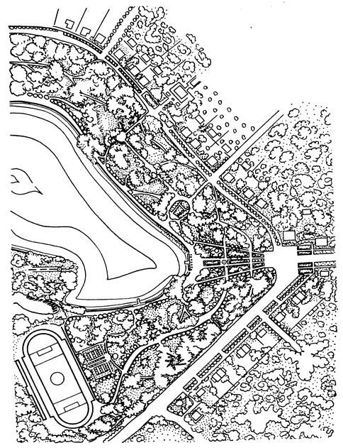 3 Планировка спортивно-парковой территории. Её следует начинать с размещения основных объектов, к которым относятся: клуб (если он размещается на площади общественного центра), открытая летняя эстрада, танцплощадка, футбольное поле, площадка для популярных видов спорта (волейбол, баскетбол, теннис, городки и др.). Эти объекты размещаются одновременно с параллельной организацией двух основных зон парка – тихого и активного отдыха и делением зоны активного отдыха на три части: работы с детьми, массовой работы и физкультурной работы.