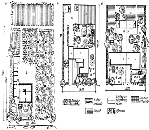 а) для северных районов: 1-жилой дом; 2-хозяйственная постройка; 3-погреб; 4-хозяйственный двор; 5-палисадник; 6-стол со скамейкой; 7-калитка; 8-ворота; 9-компостная яма;10-ульи; 11-огород;