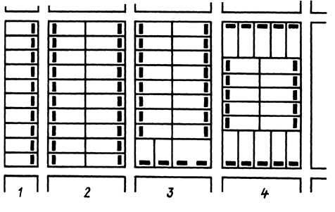 в) блокированные дома могут быть двух-, трех-, четырех- и более квартирными (рисунок 2). На одну квартиру выделяется не менее 0,06 га, так как хозяйственные постройки рекомендуется размещать на участках не менее 0,06 га. Участки блокированных домов следует делить на приквартирные части, стремясь к тому, чтобы они были равновеликими. Наиболее целесообразные варианты деления участков при доме показаны на рисунке 2.