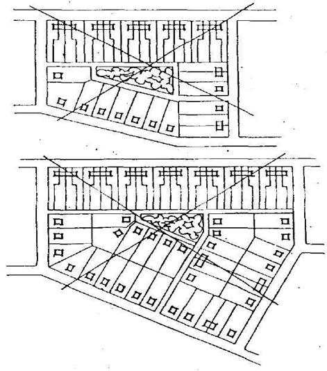 При размещении застройки с участками на территории жилых комплексов, имеющих неправильные геометрические формы, допускается несколько участков проектировать неправильной формы, но обязательно равновеликими с участками прямоугольной формы (рисунок 6 б). В этом случае следует избегать острых углов, допуская в исключительных случаях углы более 600.