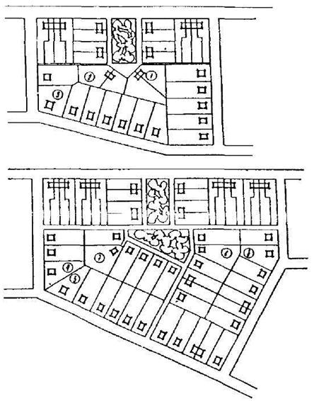 б) оставшаяся внутри комплекса незанятая территория организуется так, что по ее границам намечаются вторые ряды застройки (параллельно этой свободной территории). В результате при площадке комплекса в пределах 5 га, в центре его получается зеленая зона первичного обслуживания достаточного размера (около 0,5 га) (рисунок 6 б).