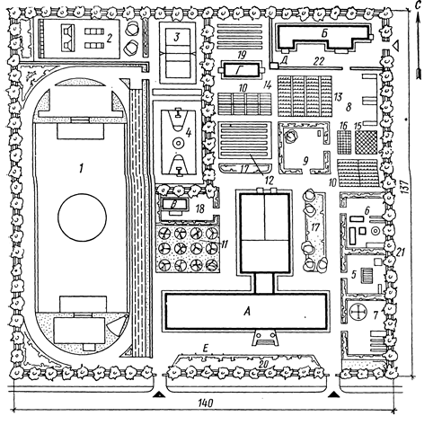 А-здание школы; Б-хозяйственный корпус; В и Г - теневой навес; Д-сарай; Е-флагштоки; 1-спортивное ядро; 2-площадка для городков; 3-волейбольная площадка; 4, 5 и 6-спортивная площадка для школьников 1-4 классов; 7-то же, для школьников 5-8 классов; 8-зоологическая площадка; 9-географическая и метеорологическая площадки; 10-участок начальных классов; 11-плодово-ягодный сад; 12-питомник плодово-ягодных и лекарственных растений; 13-участок овощных культур; 14-участок полевых культур; 15-участок сеянцев; 16-коллекционный участок; 17-участок декоративных растений и цветов; 18-площадка для занятий на воздухе; 19-парники; 20-газоны и декоративная зелень; 21-ветрозащитная полоса; 22-хозяйственный двор.