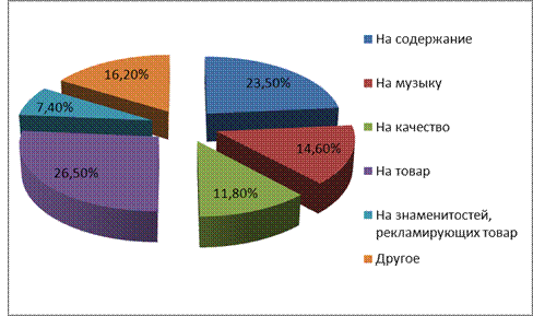 Таким образом, мы видим большое расхождение во мнениях респондентов по факторам, привлекающих внимание в рекламе. На первой место респонденты ставят товар (26,5%), на второе – содержание рекламы (23,5%).