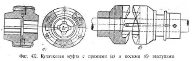Кулачковые муфты применяются преимущественно в старых установках при небольших крутящих моментах и встречаются двух типов с прямоугольными (фиг. 432, а) и треугольными выступами (фиг. 432, 6).