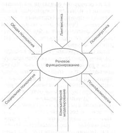 Одну из основных проблем (трудностей) рассматриваемой области составляет многопрофильность ее объекта, отчетливо обнаруживаемая в приведенных нами материалах. Они показывают, что различные науки и подходы (психология, лингвистика, социология, психофизиология, психоакустика, компьютерное моделирование) вносят свой вклад в исследование речи и языка. Внутри психологии тема речи^ тесно связанна со многими другими темами: личности, мышления, эмоции, памяти. Способность человека выразить в словах то или другое психологическое состояние — мысль, чувство, воспоминание, опасение, желание — в каком-то смысле является всепроникающей. Соответственно адекватное описание речевого функционирования по своей сущности оказывается комплексным и многоплановым. Данные разных наук и подходов должны быть привлечены для такого описания. На рис. 3.36 показан их возможный на сегодняшний день состав.