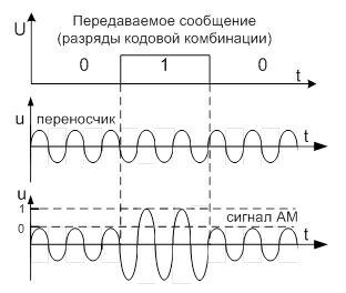Амплитудная модуляция (АМ) характеризуется изменением амплитуды переносчика в соответствии с законом изменения состояния источника сообщения (рис. 2.8).