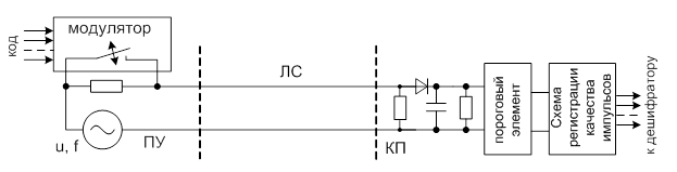 Амплитудный признак может использоваться как в цепях постоянного, так и переменного тока. Цепи постоянного тока с АМ применяются для передачи информации между отдельными узлами аппаратуры пунктов управления и контролируемых постов. Однако амплитуда импульсов легко искажается в результате воздействия помех, утечек между прямым и обратным проводами линии связи, колебаний напряжения питания и пр., поэтому в системах ДЦ для передачи информации на значительные расстояния (между ПУ и КП) амплитудный признак не применяется.