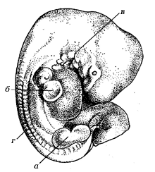 Рис. 18. Тридцатидневный зародыш человека: а, б – зачатки верхних и нижних конечностей, в – жаберные щели, г – сомиты