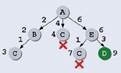Далее рассматриваем все пути, состоящие из двух ребер: из Bможно ехать в C(или вернуться в A, но такой вариант нас не интересует), из C— в B, Dи Е, а из E— в Си D. Однако первый же из рассмотренных путей, ABC, имеет длину 3, что меньше, чем длина ребра AC(4). Поэтому все пути, начинающиеся с ребра AC, можно далее вообще не рассматривать — в любом случае переезд из Ав Cчерез Bбудет на 1 короче, чем напрямую. По этой же причине не нужно рассматривать пути, начинающиеся с AEC(длина этого пути равна 7, что больше уже известного пути в Cдлиной 3):