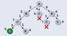 Получаем еще один (лучший на данный момент!) путь ABCDиз Aв Dдлиной 8. С другой стороны, длина пути ABCEменьше, чем длина предыдущего известного пути из Aв E(путь AE, длина 6), поэтому на этой ветке, возможно, удастся еще улучшить результат. И действительно, из Eимеет смысл ехать только в D(возвращаться в Aили в Cне стоит), и этот путь имеет длину 7: