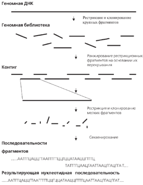 При секвенировании простейших организмов, у которых геном относительно невелик, обычно используют процедуру, называемую условно «сверху вниз». Всю ДНК «разрезают» на кусочки с помощью уже упоминавшихся выше ферментов рестриктаз, затем секвенируют эти кусочки по отдельности, а после «склеивают» из них полный геном. «Склеивание» оригинала осуществляется за счет того, что нуклеотидные последовательности разных кусочков перекрываются друг с другом, т. е. одинаковы по концам. Эта методология получила название «дробовика».