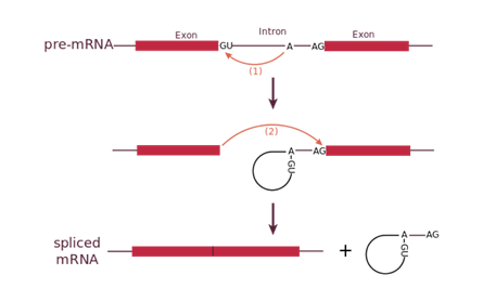 Сплайсинг - один из этапов образования функционально активных молекул РНК (процессинг РНК) из их предшественников[1], который осуществляется после завершения транскрипции (синтез РНК на ДНК-матрице). В результате удаления каждого интрона[2] происходит разрыв двух фосфодиэфирных связей с последующим образованием одной новой.