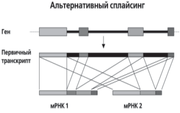 Сущность альтернативного сплайсинга заключается в том, что в результате посттранскрипционного процессинга предшественника мРНК, из которого в результате сплайсинга вырезаются некодирующие последовательности нуклеотидов, соответствующие интронам транскрибированного гена, образуются зрелые мРНК, различающиеся по своей первичной структуре. В результате в разных клетках из одного и того же предшественника получаются молекулы зрелых мРНК, которые объединяют в различных комбинациях последовательности экзонов транскрибированного гена.