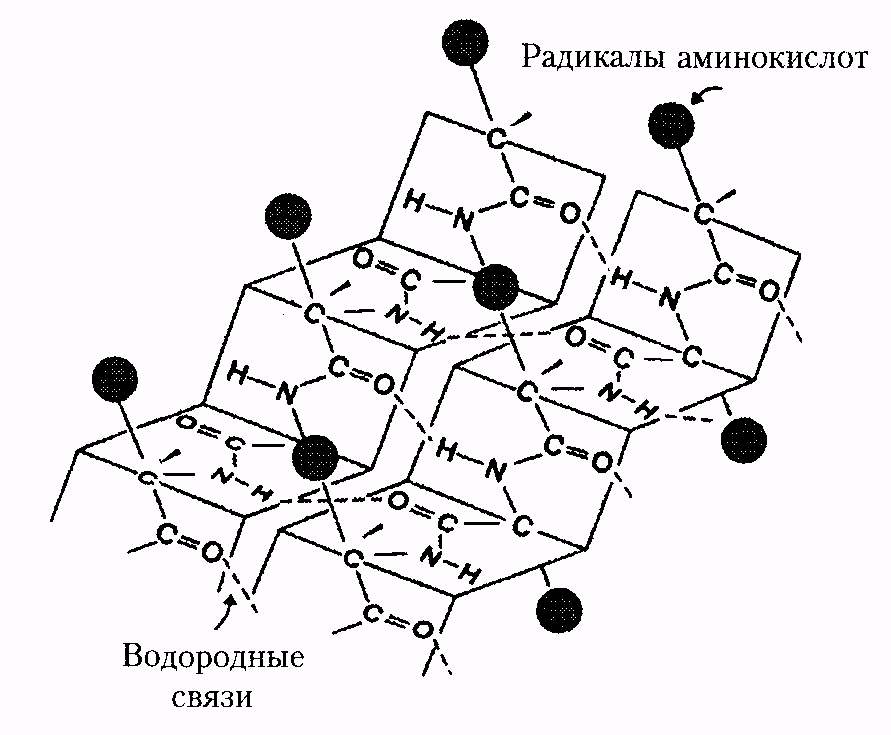 Тип конфигурации полипептидных цепей, когда сегменты пептидной цепи располагаются в один слой, образуя структуру, подобную листу, сложенному в гармошку, называется b-структурой. Такой тип вторичной структуры обнаружен в белках мышц, волос, шелка. b-Слой может быть внутримолекулярным, а также образованным двумя или более полипептидными цепями.
