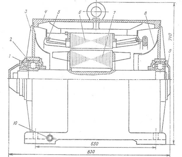 Состоит из; 1.крышка подшипника, 2.Изолированный подшипник, 3.Подшипниковый щит, 4.Станина, 5.Бандажное кольцо, 6.Статор, 7.Ротор, 8.Направляющая воронка, 9.Подшипниковый щит, 10.Болт заземления.