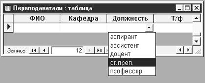 10. Откройте таблицу Преподаватели в режиме Таблицыи введите в нее данные согласно рис. 14. Обратите внимание, как работает маска в поле Кафедра. Воспользуйтесь списком подстановок для ввода должности преподавателя.