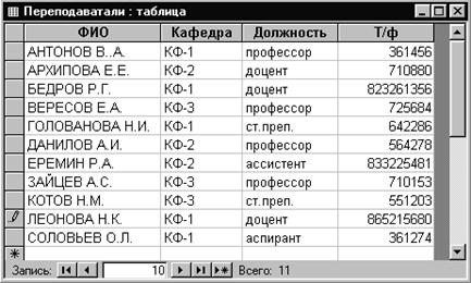 Рис.14. Таблица Преподаватели открыта в режиме Таблицы