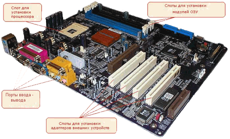 На ней размещаются системная магистраль и имеются разъёмные соединения для установки процессора, внутренней памяти и контроллеров внешних устройств (слоты). Это дает пользователю возможность самому комплектовать компьютер, при необходимости модернизировать или ремонтировать путём замены модулей. На рисунке ниже показан фрагмент материнской платы с установленными модулями оперативной памяти.