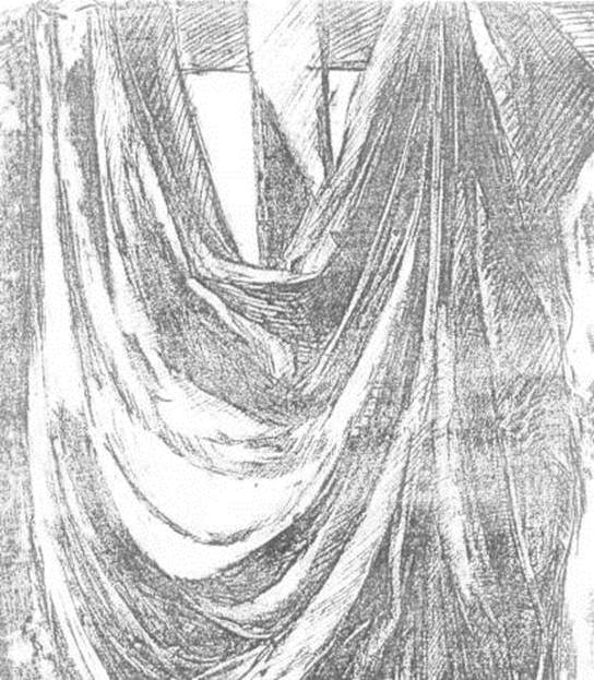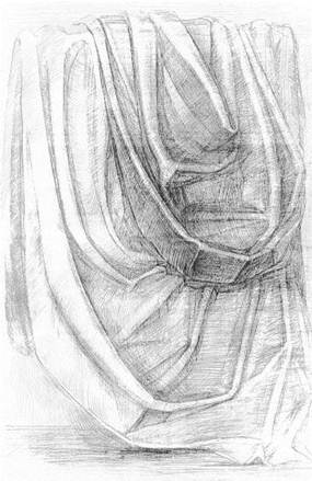 Драпировка – это ткань, наброшенная на предмет или закрепленная на плоскости в одной или нескольких точках, спадающая вниз и образующая различные складки. Ткань не имеет четкой стабильной формы и принимает форму того предмета, на который она накинута. Если ткань спускается с предмета или с иной точки опоры, то образует различного вида складки – драпируется. Все складки можно разделить на три основные типа: прямые, диагональные (косые) и радиальные. Поверхность наибольшей выпуклости принято называть гребнем складки, а поверхность наибольшей глубины – дном складки. Расстояние от дна складки до гребня называют высотой, или глубиной, складки. Необходимо прочувствовать объемность складок, их конструкцию, постараться на первом этапе «разбить» большие массы, выявлять объем за счет толщины линии, удаленность каждой складки. После построения и определения композиционного центра студенты слегка штрихуют все темные места драпировки, штрих кладут по форме движения складок, а в углублениях, дне складок – вдоль натяжения поверхности ткани.