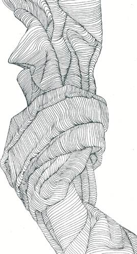 Работу рекомендуется выполнять гелиевой или капиллярной ручкой. Вначале следует выбрать драпирируемую ткань (это может быть платок, шарф, лоскут ткани любой фактуры и текстуры). Формируя складки натуры, можно завязать узел. Затем на листе бумаги лёгкими движениями карандаша намечается основная форма ткани. После чего гелиевой (капиллярной) ручкой выполняется декоративная обработка складок. Во время работы обратите внимание на движение линий по форме складки, а также используйте разные виды линий для передачи плановости, глубины и объёма элементов рисунка (рис. 12).