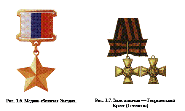 ЗНАК ОТЛИЧИЯ – ГЕОРГИЕВСКИЙ КРЕСТ(рис. 1.7).Положение о знаке отличия утверждено Указом Президента РФ от 8 августа 2000 г. № 1463. Георгиевским Крестом награждаются военнослужащие из числа солдат, матросов, сержантов и старшин, прапорщиков и мичманов, младших офицеров за подвиги и отличия в боях по защите Отечества при нападении внешнего противника, служащие образцами храбрости, самоотверженности и воинского мастерства. Знак отличия имеет четыре степени. Высшей является I степень. Награждение производится последовательно, от низшей степени к высшей.