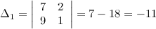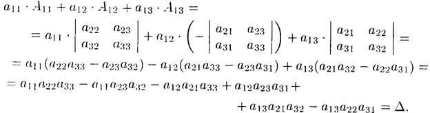 Свойство 7 («Разложение определителя по элементам некоторого ряда»). Определитель равен сумме произведений элементов некоторого ряда на соответствующие им алгебраические дополнения.