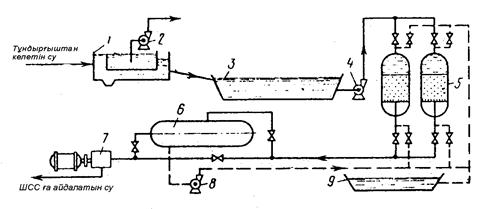| 10.1.Сурет. Ағынды суды дайындаудың ашық түрдегі қондырғысының сұлбасы 1-мұнайұстағыш; 2-мұнайұстағыштан жиналған мұнайды айдауға арналған сорап; 3-тұндырғыштар; 4-суды сүзгіге беруге арналған сорап; 5-құмды сүзгілер; 6-таза суға арналған сыйымдылық; 7-тазартылған ағынды суды ШСС беруге арналған сорап; 8-сүзгілерді шаю (тазалау) кезінде таза суды беруге арналған сорап; 9- лас суға арналған ыдыс (амбар). |