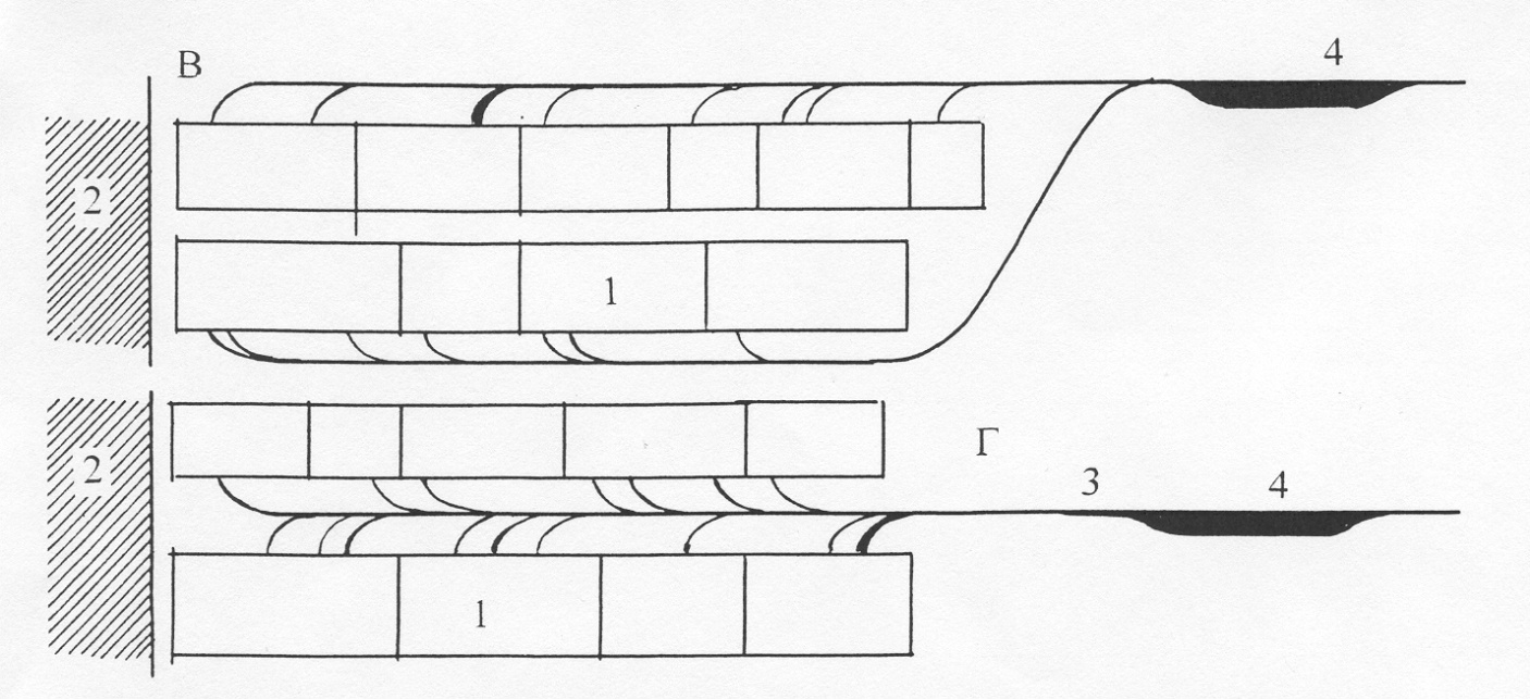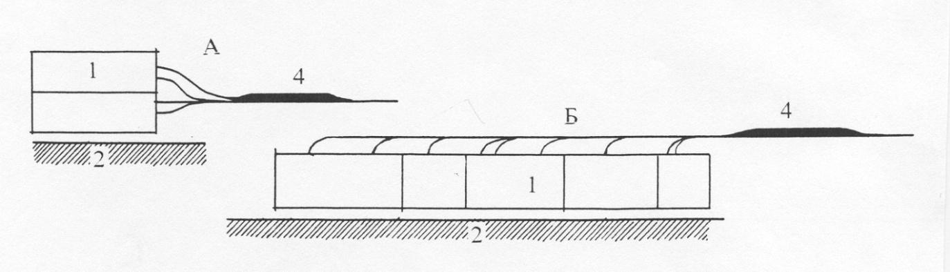 А. — тупиковая; Б — тупиковая при смешанном обслуживании железнодорожным и автомобильным (или другим) видом транспорта; вверху — с продольным, внизу — с поперечньм направлением движения автотранспорта; В — кольцевая; Г — сквозная; 1- территория складов; 2- производственное здание; 3- склад готовой продукции.