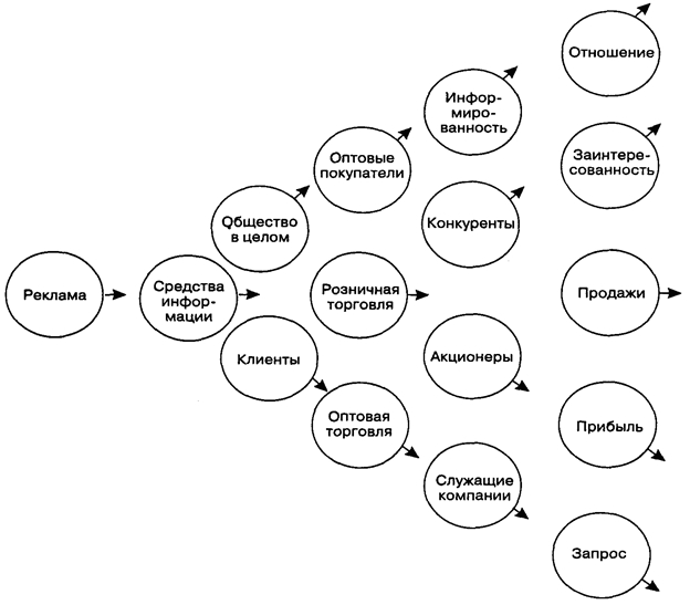 Принцип бильярдного шара (рис.) используется для формирования и раскрытия экономического эффекта рекламы. Согласно этому принципу именно от силы (величины затрат) первой рекламной кампании зависит экономическая эффективность распространения рекламы.