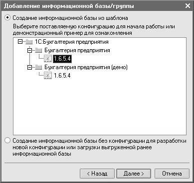 Переключатель нужно установить в положение «Создание новой информационной базы» и нажать на кнопку «Далее». Программа «1С: Предприятие 8.1» предлагает создать информационную базу на основании базы-шаблона. После нажатия на кнопку «Далее» на экран выводится диалог выбора, где нужно выделить курсором нужную строку (рис. 2.3).