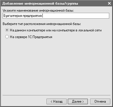 После выбора режима создания информационной базы на экран выводится диалог ввода наименования и выбора типа расположения информационной базы. По умолчанию программа предложит название выбранного шаблона, которое можно не менять (рис. 2.4).
