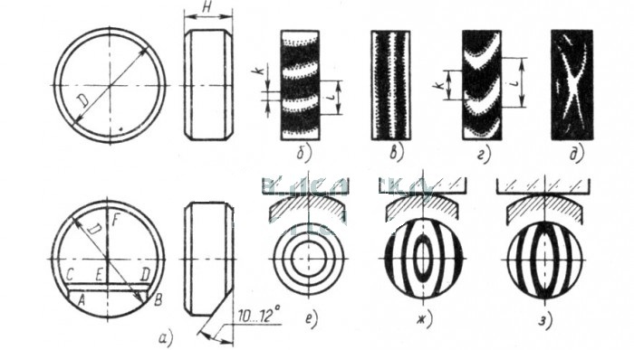 При проверке отклонения от плоскостности используют нижние пластины. Для этого пластину накладывают на ребро концевой меры и слегка прижимают к проверяемой поверхности, чтобы между ними остался небольшой воздушный клин, а затем наблюдают за появлением интерференционной картины, по которой и определяют отклонение от плоскостности. Если проверяемая поверхность выпуклая, интерференционные полосы будут искривлены от ребра (рис. 5, б, г), а если вогнутая — к ребру клина. При наложении пластины на деталь прямоугольной формы возникают интерференционные полосы (рис. 5, б...д), а при наложении на деталь круглой формы—интерференционные кольца (рис. 5, е...з). Отклонение от плоскостности оценивают отношением прогиба к к ширине полосы /. Ширина полосы соответствует изменению толщины воздушного клина на величину, равную л/2, где л — длина волны света. Половина длины волны белого света соответствует 0,3 мкм.