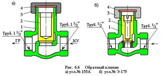 Обратные клапаны усл.№ 155А (Рис. 6.6 а) устанавливаются на нагнетательном трубопроводе между главным резервуаром и компрессором. Клапан состоит из корпуса 1 и собственно цилиндрического клапана 2, который относительно корпуса имеет небольшой зазор по диаметру. Клапан 2 изготавливают из латуни или полимерного материала. Над клапаном имеется полость, закрытая крышкой 3 с прокладкой 4. При подаче сжатого воздуха от компрессора клапан 2 поднимается. Подъем клапана происходит медленно, так как этому препятствует воздушная подушка в полости над клапаном. К концу подъема клапана эта воздушная подушка постепенно рассасывается через неплотности между клапаном и корпусом. Благодаря медленному изменению давления в полости под крышкой клапан 2 не успевает опускаться на седло в процессе пульсации давления в нагнетательном трубопроводе - этим предотвращается стук клапана. Если подача воздуха прекращается, то вследствие зазора между цилиндрической поверхностью клапана и корпусом он под действием собственного веса сядет на седло.